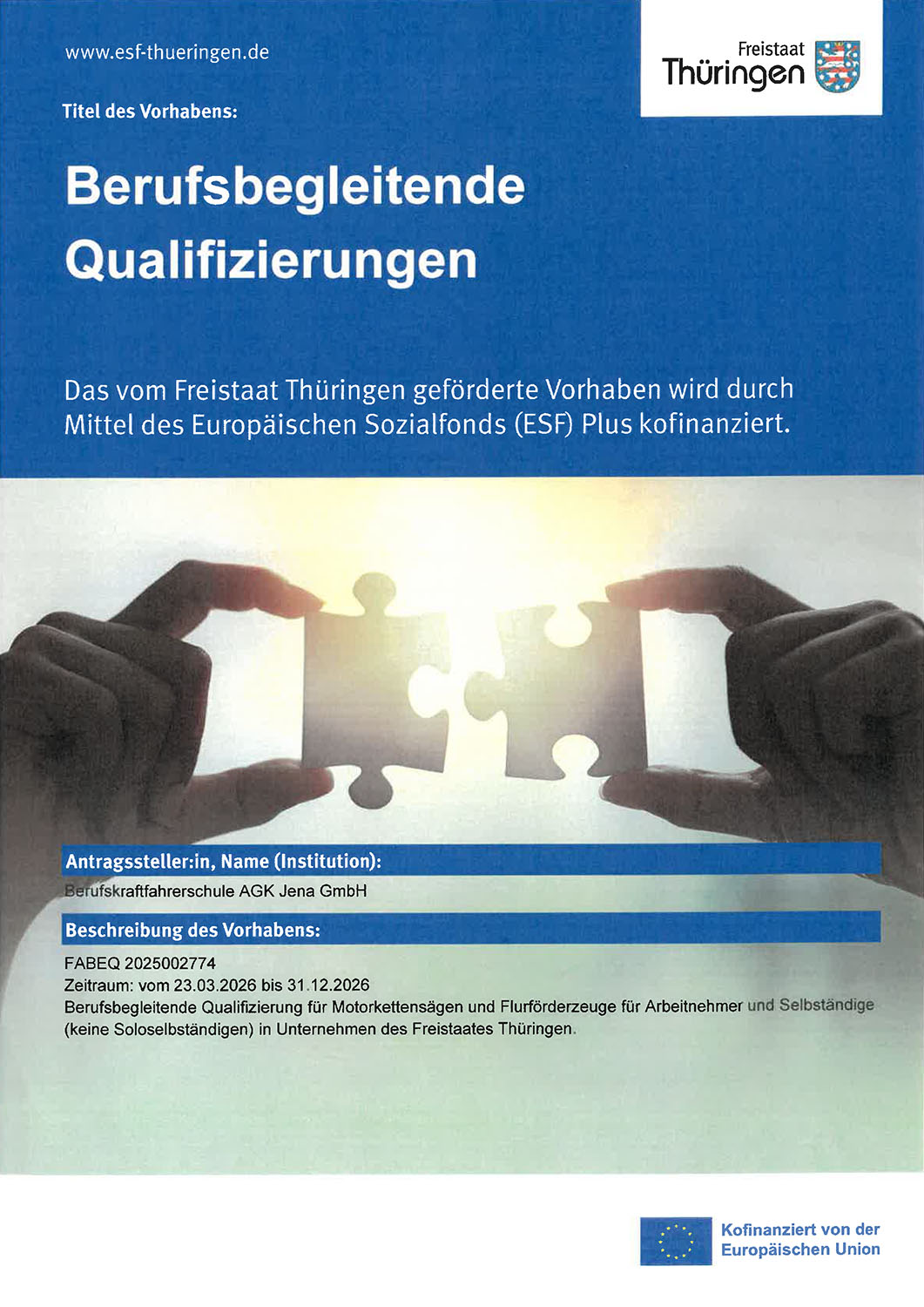 Berufsbegleitende Qualifizierung für Motorkettensäge und Flurförderzeuge für Arbeitnehmer und Selbständige (keine Soloselbständigen) in Unternehmen des Freistaates Thüringen.