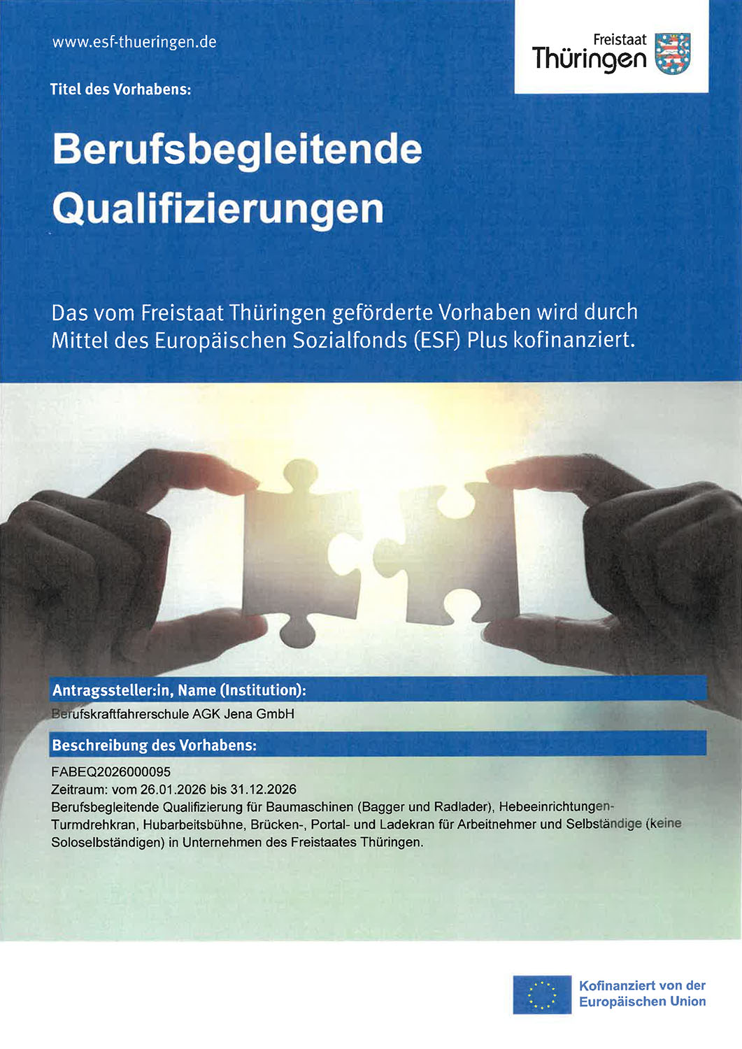 Berufsbegleitende Qualifizierung für Baumaschinen (Bagger, Radlader), Hebeeinrichtungen-Turmdrehkran, Hubarbeitsbühne, Brücken-, Portal- und Ladekräne für Arbeitnehmer und Selbständige (keine Soloselbständigen) in Unternehmen des Freistaates Thüringen.