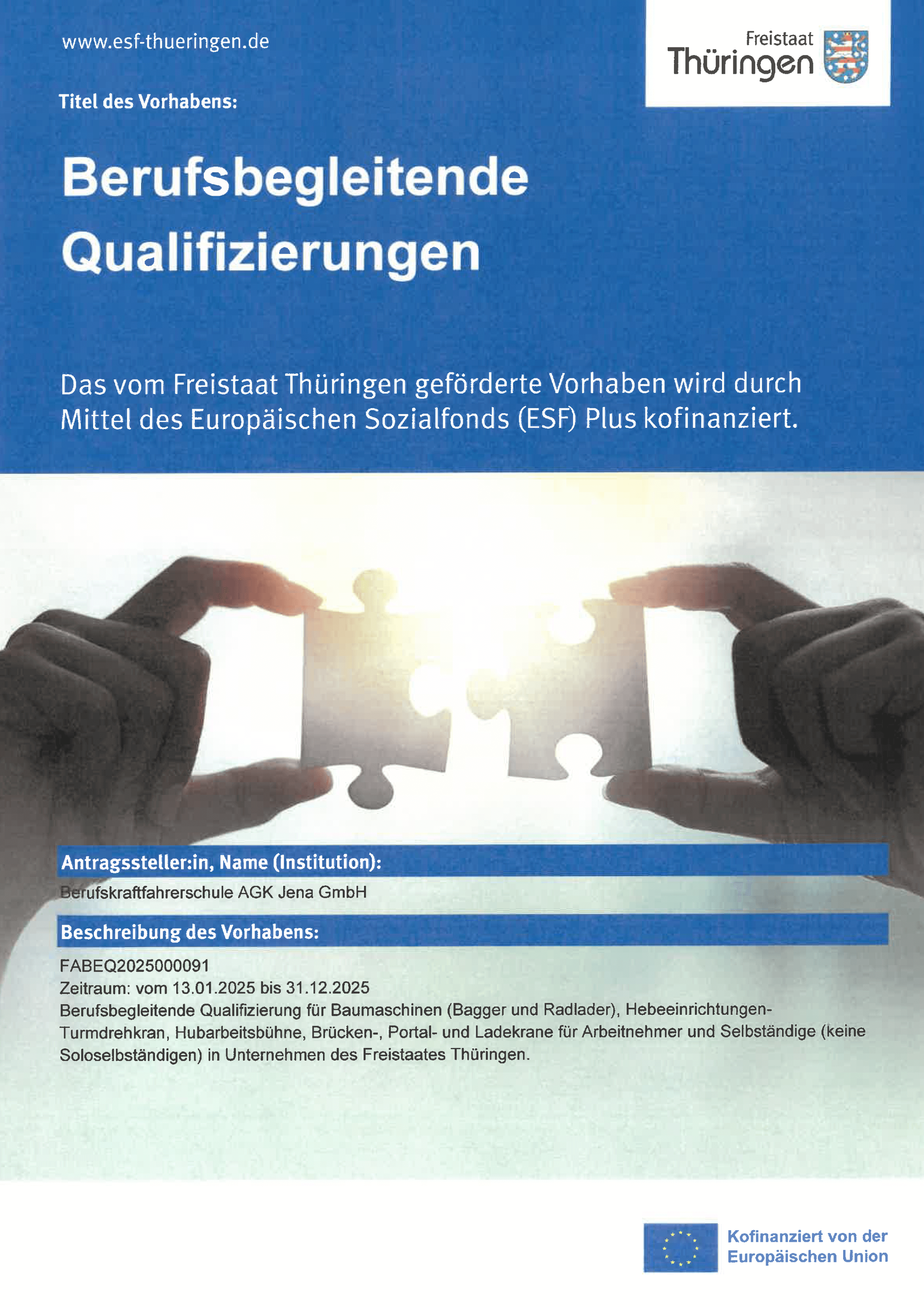 Berufsbegleitende Qualifizierung für Baumaschinen (Bagger, Radlader), Hebeeinrichtungen-Turmdrehkran, Hubarbeitsbühne, Brücken-, Portal- und Ladekräne für Arbeitnehmer und Selbständige (keine Soloselbständigen) in Unternehmen des Freistaates Thüringen.